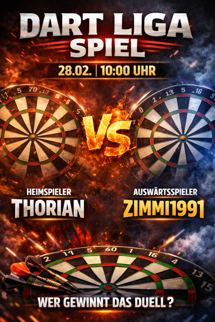 Thorian 4 vs 4 ZIMMI1991 Details Datum Zeit League Saison Match Day 28.02.2026 16:00 5. Liga Staffel D 01/2026 2 ErgebnisseMannschaftLegsSpielausgangThorian4DrawZIMMI19914Draw Thorian # Spieler Position Thorian-ZIMMI1991- ZIMMI1991 # Spieler Position Thorian-ZIMMI1991-